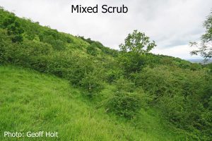 The density of scrub across the site is variable with some areas being relatively lightly scrubbed whilst others have a high density and are potentially developing into woodland. Some of the scrub areas support a limestone grassland herb layer. In other areas the grassland has been shaded out and hence a management regime of cutting is required to stop it dominating the more important grassland too much.