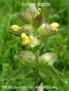 Yellow Rattle, the name comes from the noise made when the seed filled pods are shaken, is an annual and is soon lost from a site if it is not allowed to set seed. Often the abundance of Yellow Rattle can fluctuate over the years. After a year with a large number of plants, then the grasses may be so weakened that the parasite’s seed production is reduced so that the next years population must be smaller, or that the grasses do not recover adequately in the second year to support a large new population. This pattern can show itself as a wave of Yellow Rattle that moves across a grassland over the years.