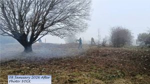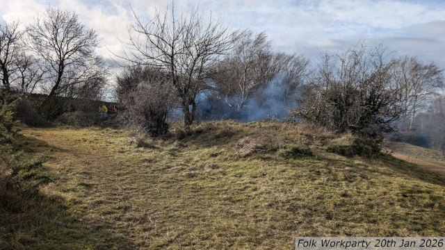 For the first work party of 2026, FOLK had a pretty good attendance (15), especially given the weather forecast. Fortunately it remained dry and it allowed us to have a fire and to burn the arisings from a previous task on one of the firebreaks on Charlton Kings Common east. We continued work to widen this break and also cleared gorse from a nearby good area of grassland, as evidenced by the presence of some of the cattle doing what they are meant to do! The cattle kept an eye on us throughout! We achieved our main objective of burning all the cut gorse and expanding the break.