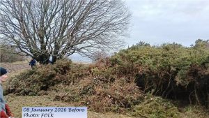 The aim is to continue to increase the grassy areas between the gorse to allow the cattle to do their bit, as advised by Natural England. Twelve of us today. Thanks to all.