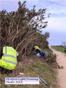 Joint work party with the Cotswold Wardens. We had a near record number of FOLK volunteers -19, with 5 from the wardens. This enabled us to continue our objective of creating additional fire breaks in between the large swathes of gorse on top of the eastern end of the Common. A large and wide area of gorse was removed and taken to the fire site, where despite the blustery conditions a fire was successfully managed.